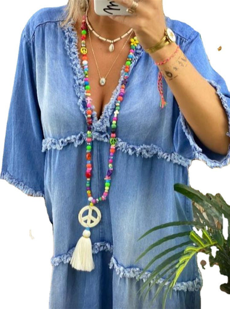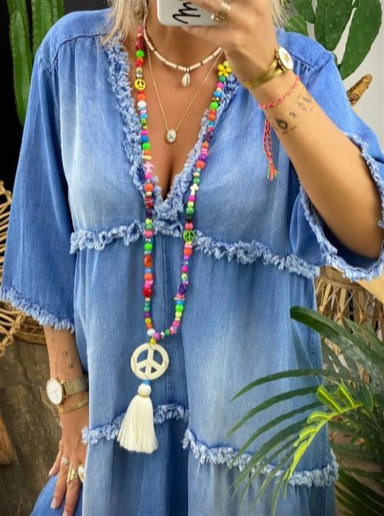 Rochie trapez boemă Cristina - Inspirație imprimeu albastru