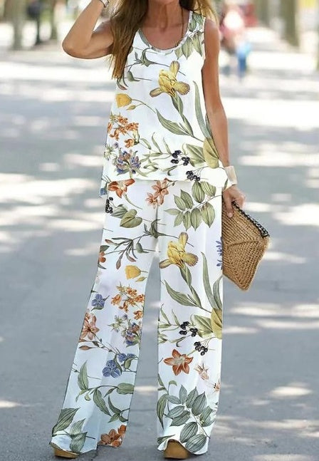 - Include un top fără mâneci cu imprimeu și pantaloni cu croi larg