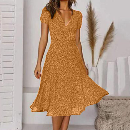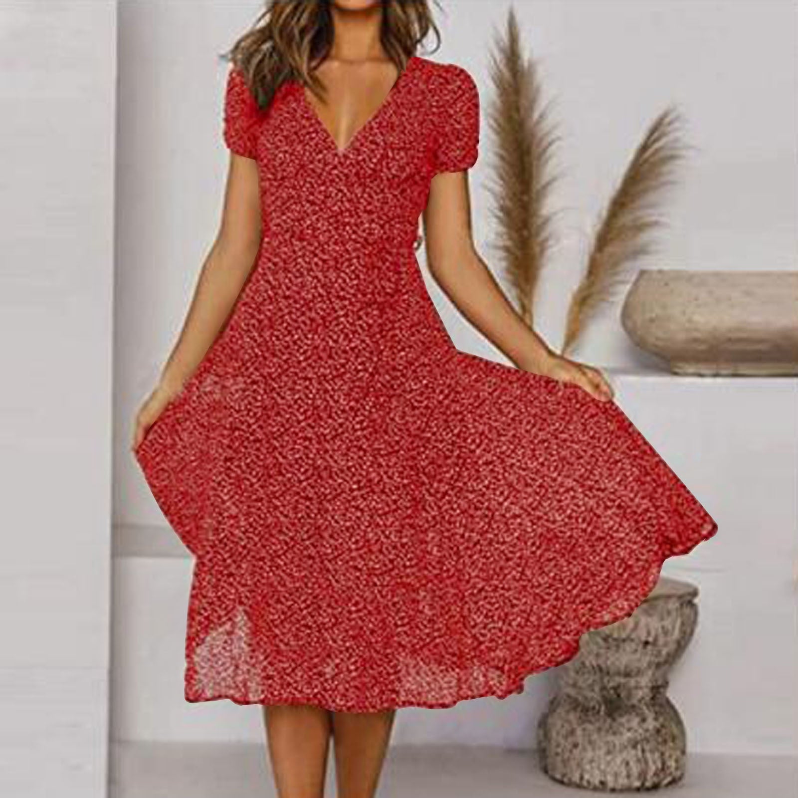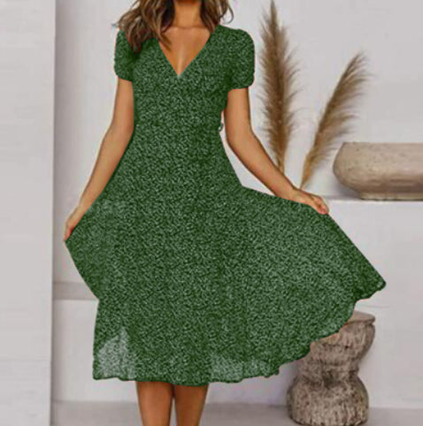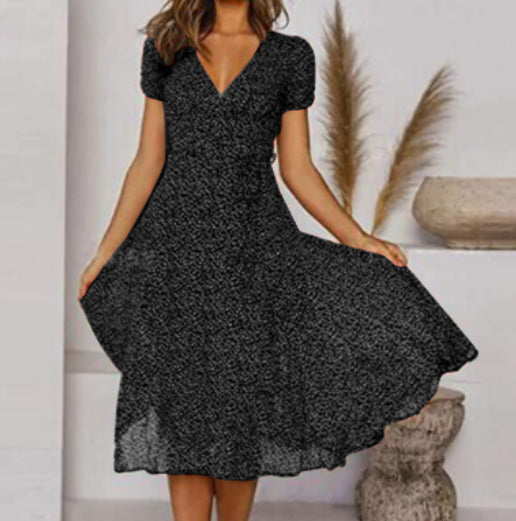 - Mânecile scurte și lungimea midi creează un look versatil.