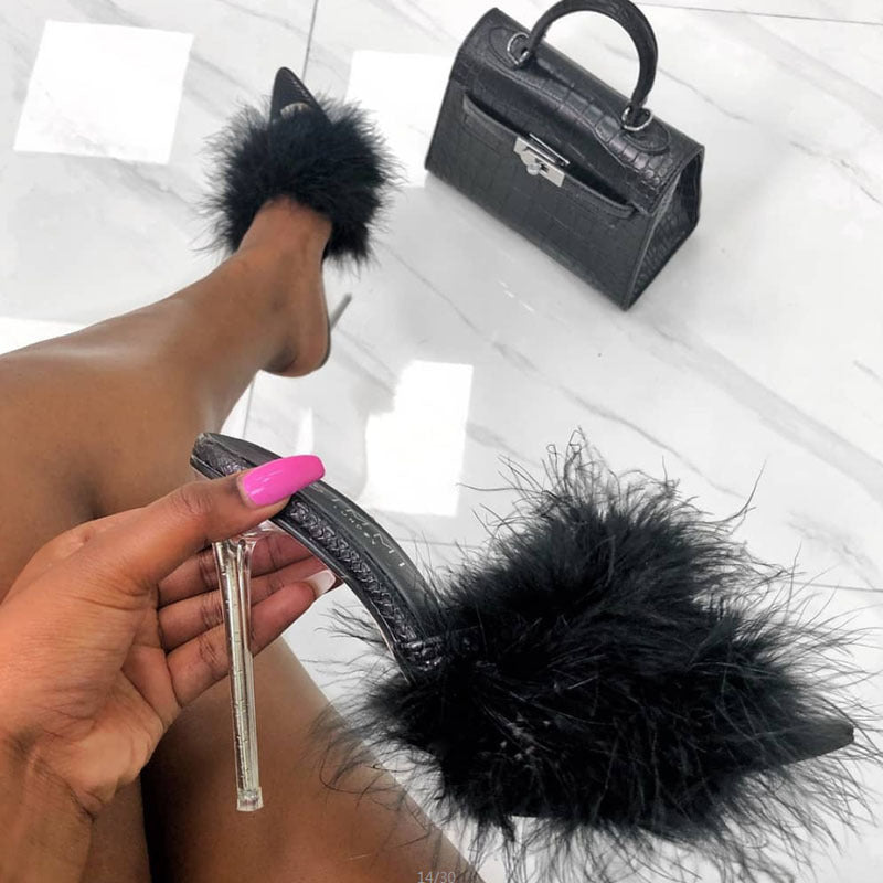Pantofi cu cristale Cristina - Papuci negri din blană cu pene