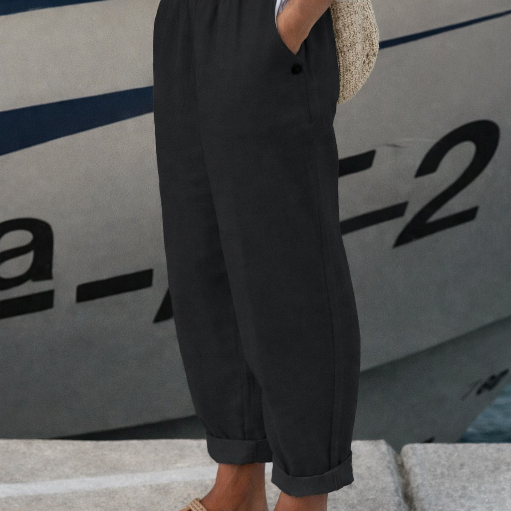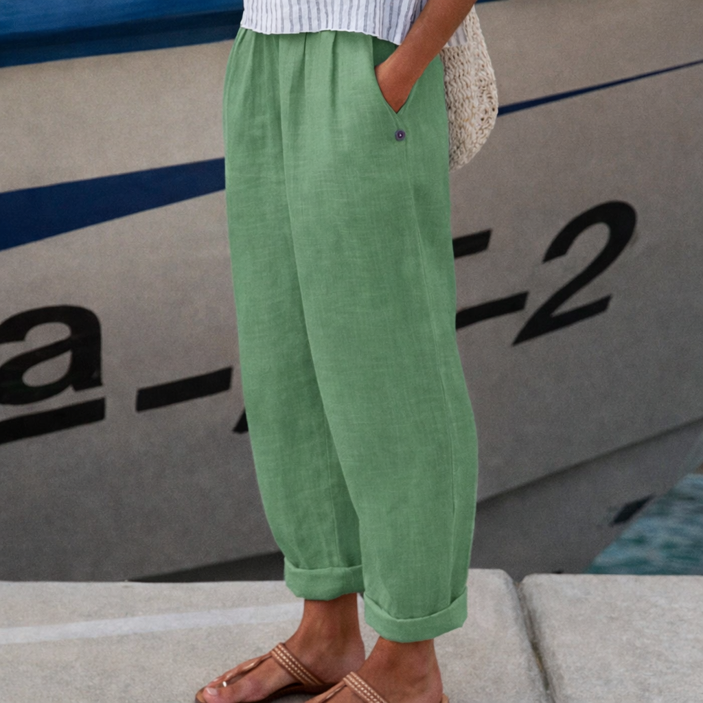 Pantaloni Cristina cu croială dreaptă din bumbac și in - Model cu buzunar